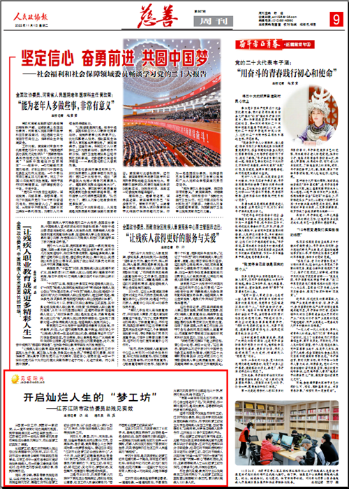 《人民政协报》2022年11月01日第09版刊发《开启灿烂人生的“梦工坊”——江苏江阴市政协委员助残见实效》。