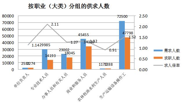 从供求状况对比看,专业技术人员、生产运输设备操作工供不应求的矛盾较为突出,求人倍率分别为2.11和1.52。